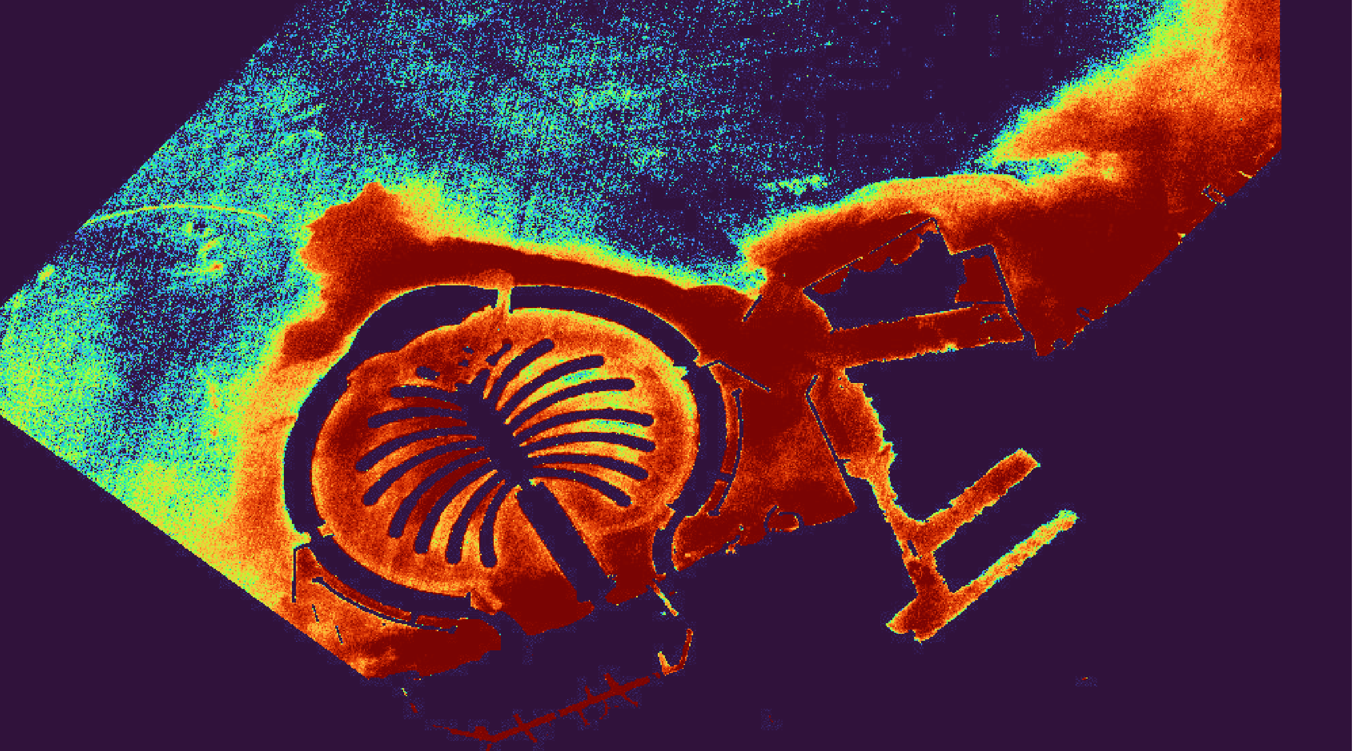 Complete bathymetric mapping of the iconic Palm Jumeirah, including the palm fronds, crescent, and surrounding navigation channels. The output reveals sediment accumulation patterns and depth variations critical for ongoing maintenance operations.